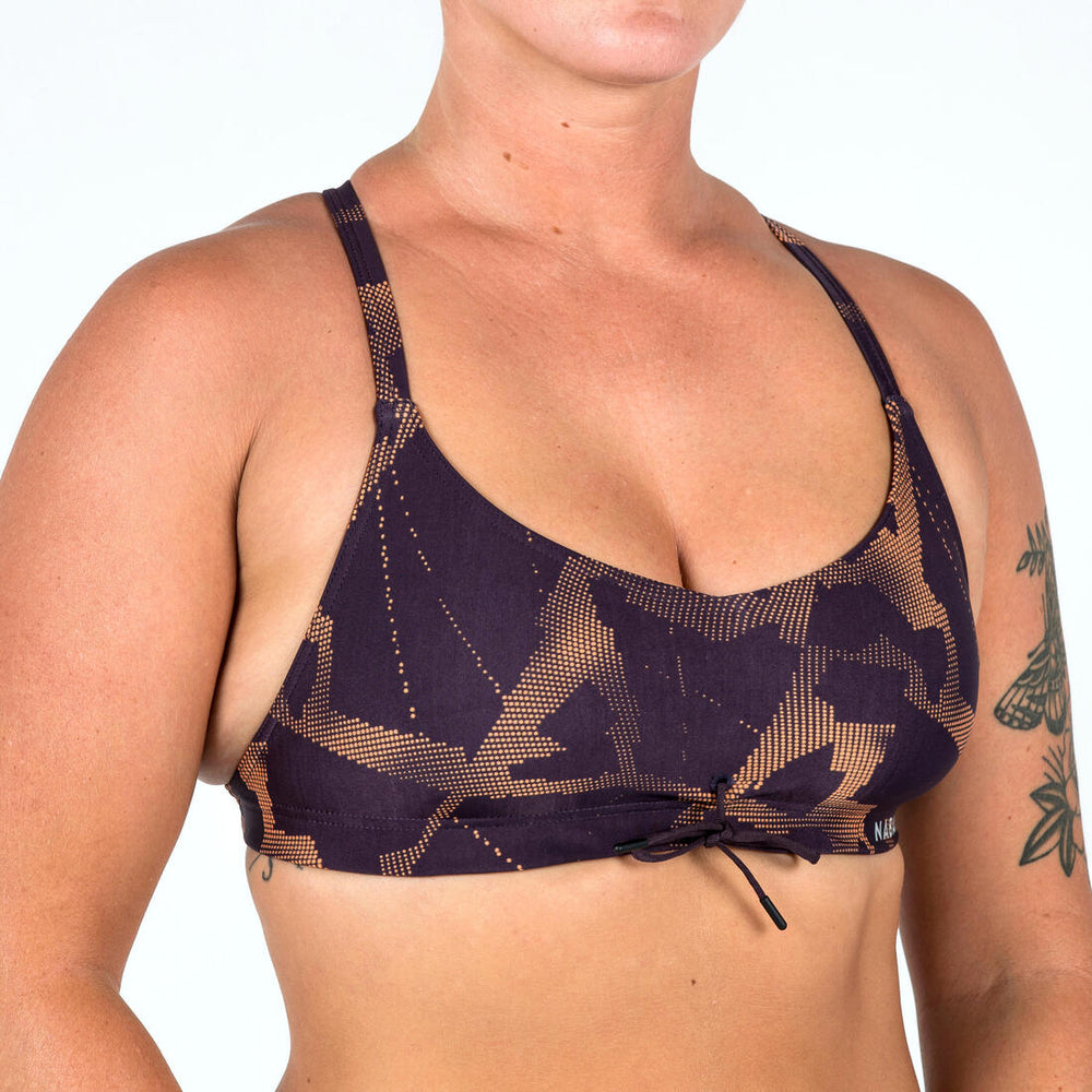 Ajustable à votre convenance grâce au cordon, cette brassière de natation aux bretelles fines et croisées limite les entrées d'eau sur les 4 nages, quelle que soit l’intensité.