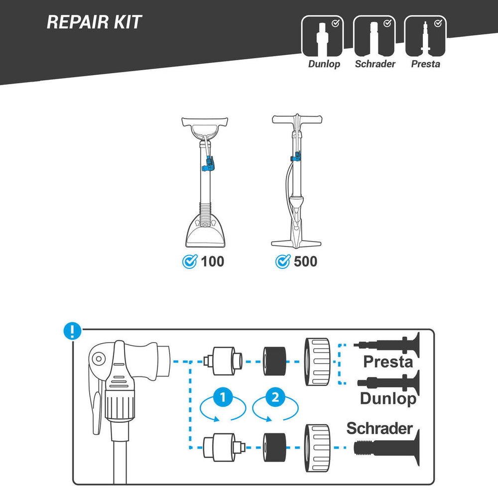 En cas de perte d'une pièce sur votre pompe, ne la jetez plus. Grâce à ce kit d'embout de réparation , la durée de vie de vos pompes à pied Btwin 100 et 500 est prolongée.