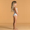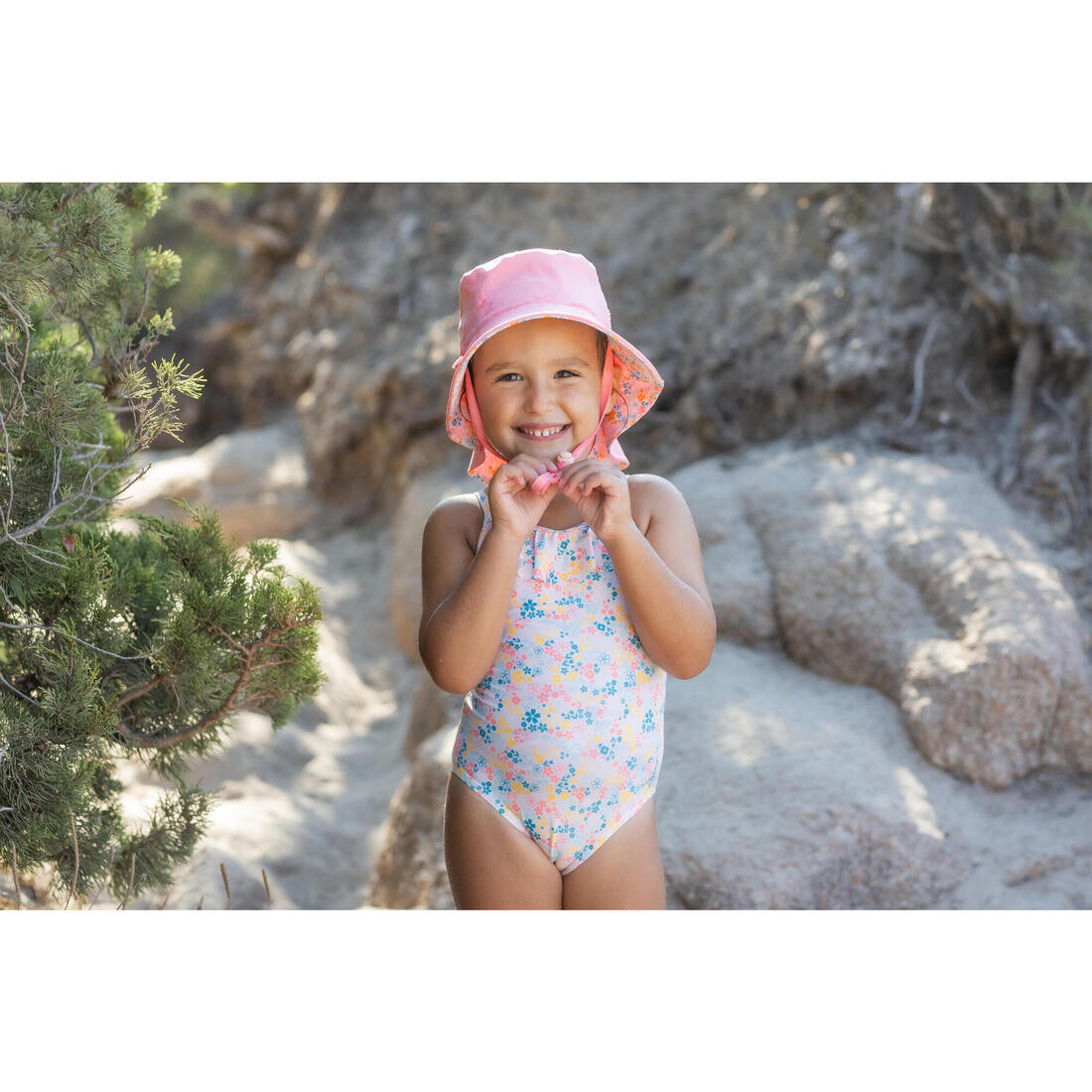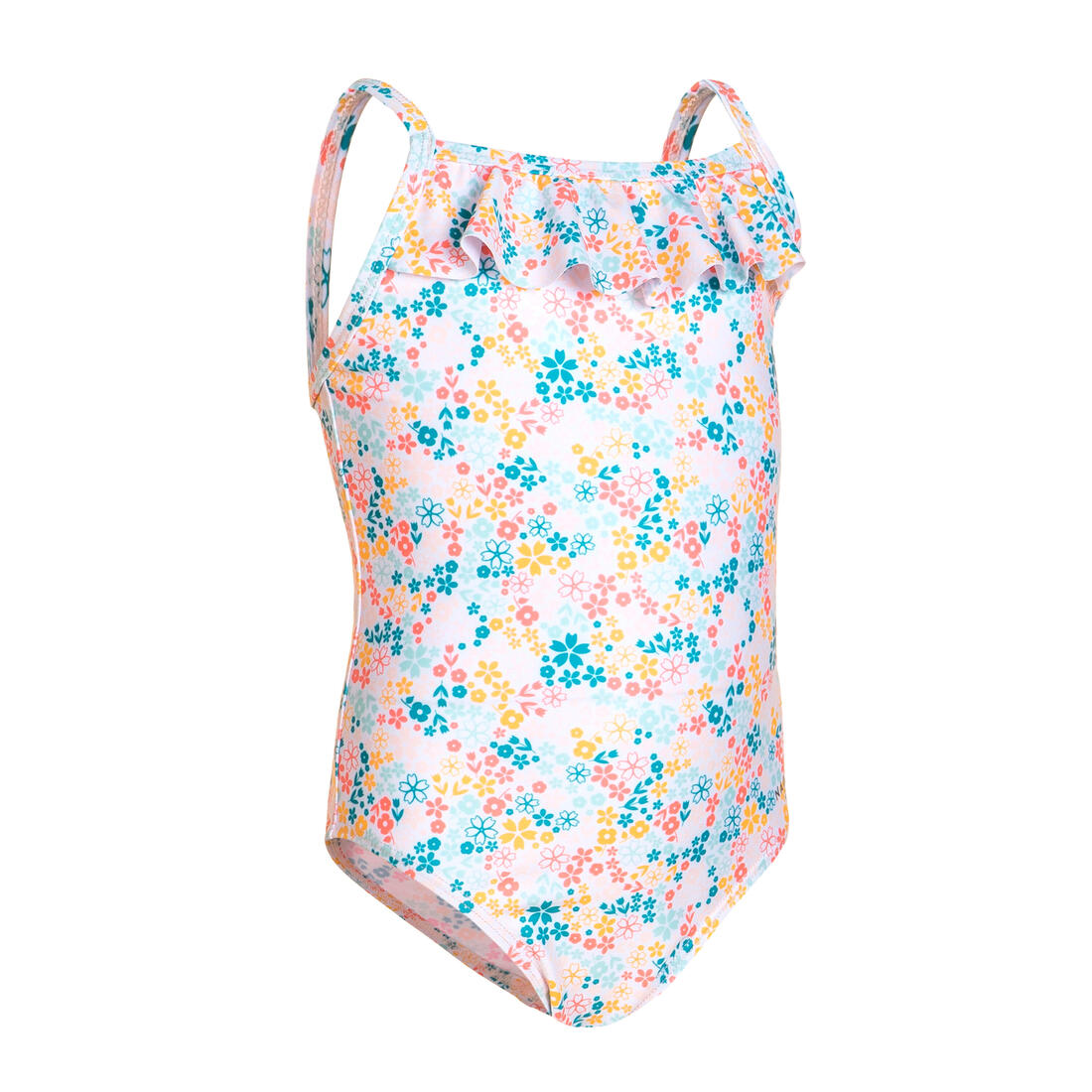 Son premier maillot de bain une pièce, avec des fines bretelles non croisées pour faciliter l'enfilage. Son petit plus ? Ses imprimés acidulés et ses froufrous !